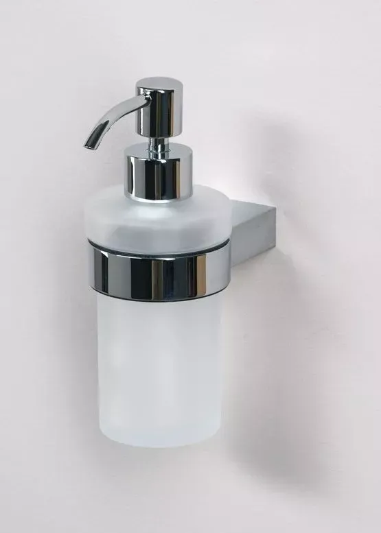 Дозатор для жидкого мыла Aquanet 5681-J из матового стекла больше напоминает стильный флакон для парфюмерной воды. Предусмотренное для него массивное крепление к стене перетекает в широкое кольцо, в котором надежно установлена емкость дозатора. Объема жидкого мыла, помещающегося в нем, хватит на длительное время. Такая практичная и в то же время продуманная вещь будет хороша в интерьере, оформленном в любом стиле, а ее хромированная часть будет аккомпанировать по цвету и стилю со смесителем.