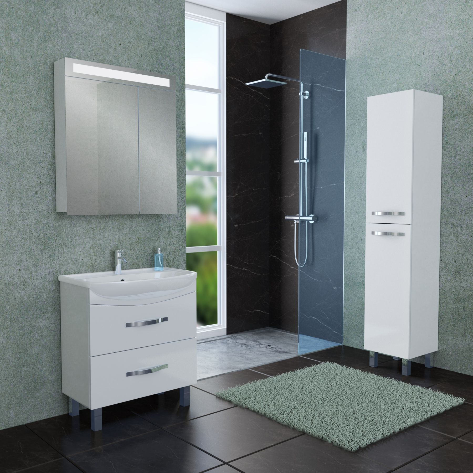 Строгий минимализм, лаконичный дизайн, глянцевая поверхность фасада, идеальное качество покраски. В комплект можно подобрать зеркальные шкафы, пенал, полупенал.