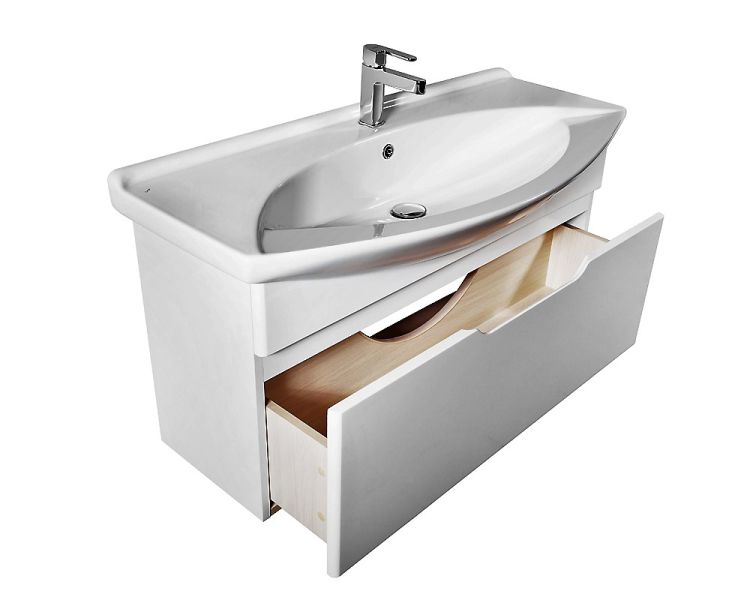 Подвесная классическая коллекция Лаконичный дизайн, глянцевая поверхность фасада, механизмы Hettich. Небольшая глубина тумбы органично впишется в любую, даже небольшую ванную комнату. Глубокий ящик
