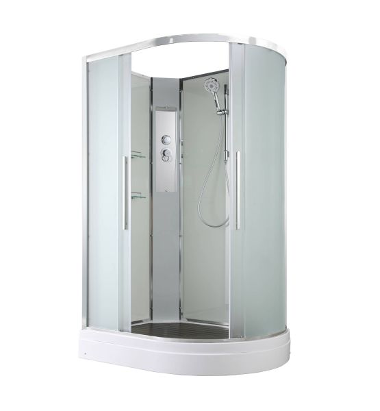 Стильная душевая кабина AvaCan EM2811LN сочетает в себе высокую функциональность, практичность и надежность. При изготовлении применяется безопасное закаленное стекло толщиной 5 мм (матовое), надежно фиксируемое алюминиевым профилем. Сборка без силикона (увеличивает срок службы), внутренняя сборка(облегчает установку и ревизию; позволяет установить в ограниченном пространстве), смеситель резьбовой (без хомутов). Съемный экран поддона (позволяет осуществлять ревизию сифона). Цвет профиля  хром. Двойные металлические ролики дверей (увеличивают срок службы).В комплекте : душевая штанга, две полочки , арома-лейка с витамином С (картридж съемный),полимерная вставка в поддон(имитация дерева),сифон, ручки дверей из нержавейки , двойные ролики .
