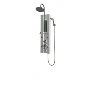 ~ панель серебристая ~ полочка ~ зеркало ~ смеситель с переключ. режимов ~ верхний душ, ~ ручной душ 3-х режим. ~ держатель руч.душа ~ г/м форс.4шт ~ набор воды ~ высота 100 см + 24 см верхний душ