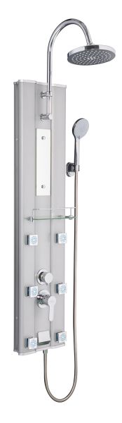 Панель акриловая (мат.хром)Верхний душПолочкаЗеркалоСмеситель с переключением режимовРучной душ 3-х позиций Держатель ручки душаг/м форс.6штнабор водыВозможна установка на стену и в угол