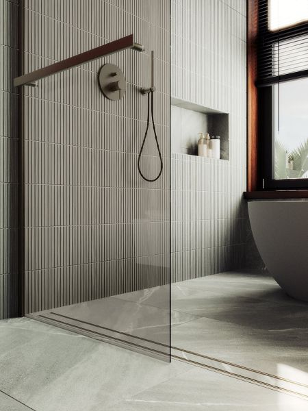 Душевая перегородка в профиле с полотенцесушителем представляет собой компактное и функциональное решение для разделения пространства в ванной комнате . Она изготовлена из закаленного стекла,анодированного алюминиевого профиля, что обеспечивает прочность и долговечность конструкции. Закаленное стекло , цвет бронза , толщина 8 мм , 1950*790-1 шт.