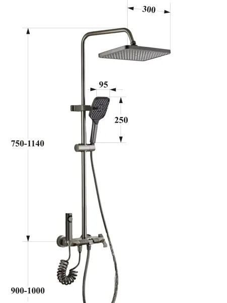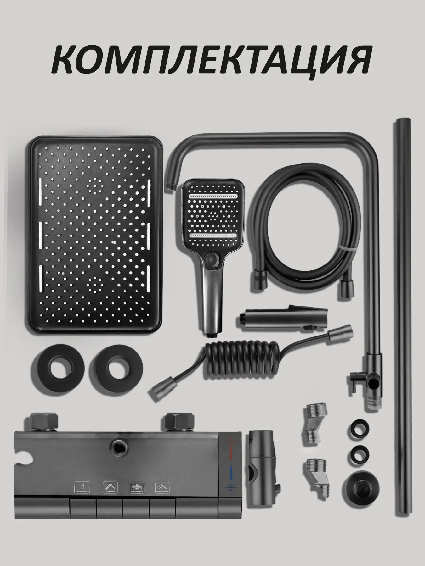 В комплекте есть всё для немедленного старта: тропический душ, ручной душ, гигиенический душ, душевая штанга, все необходимые держатели, кронштейны, смеситель и отражатели. Подключение к стандартным водопроводным выходам (½ дюйма).