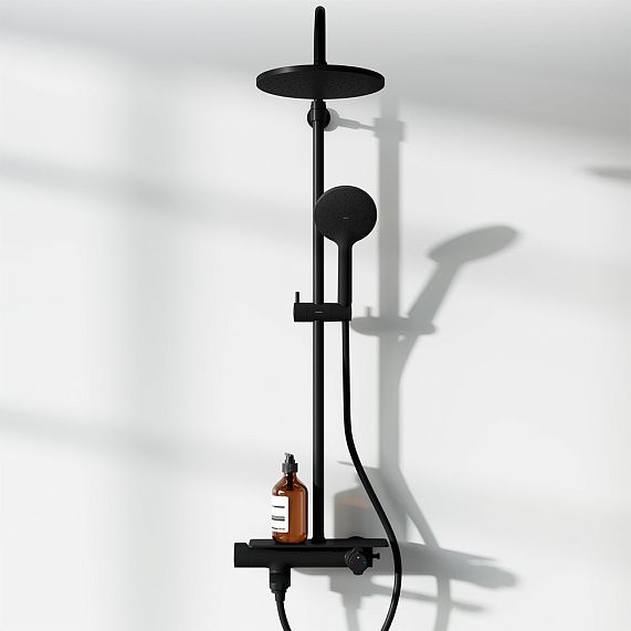 Стильный и лаконичный дизайн душевой системы Jupiter в матовом черном исполнении прекрасно подойдет как для классической, так и для современной ванной комнаты. Максимальная безопасность: термостатический картридж 35 мм обеспечивает точную настройку температуры и напора воды. Непревзойдённый комфорт и удобство: смеситель выполнен в виде компактной полочки, где вы можете хранить все необходимые вещи.Благодаря телескопической штанге с диапазоном регулировки 400 мм ежедневные процедуры будут одинаково комфортны для людей любого роста. Большое количество форсунок с микроотверстиями, которые распределяют поток мягкими равномерными струями, обеспечит вам расслабляющий эффект настоящего домашнего SPA.Переключайте потоки воды между ручной и тропической лейками плавным поворотом левой ручки смесителя, а между смесителем и ручной лейкой - поворотом излива на 90 градусов. Угол наклона тропической лейки можно регулировать.Инновационное PVD-покрытие гарантирует чрезвычайную прочность душевой системы. Матово-черная поверхность не выцветает с годами и устойчива к механическим повреждениям, загрязнениям и отпечаткам пальцев.