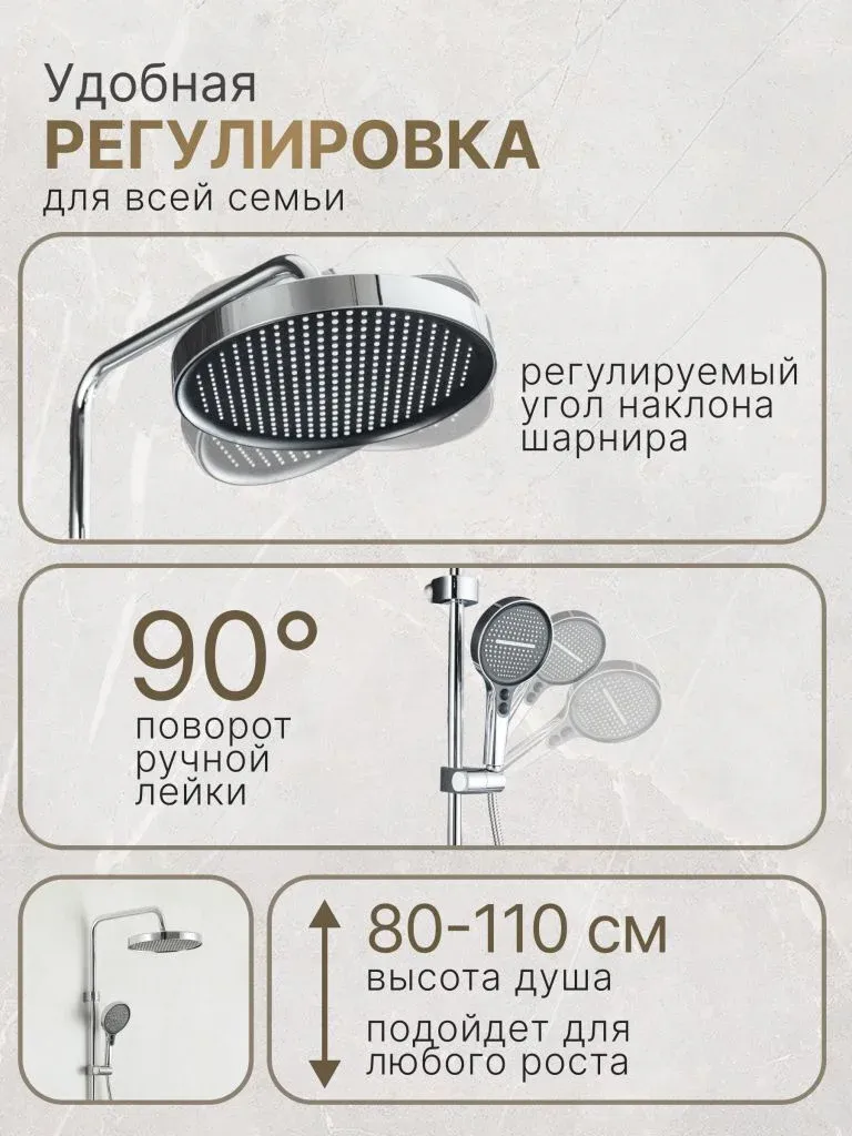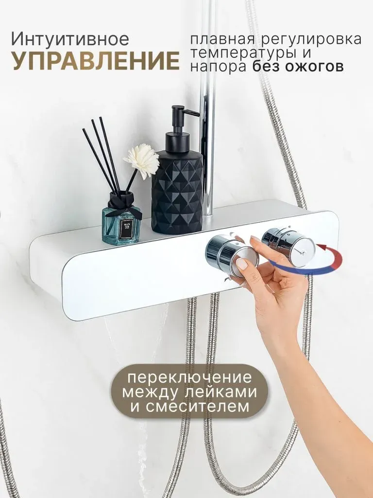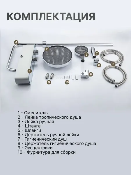 Душевой комплект содержит все необходимое для монтажа. Кроме того, наша душевая стойка с дисплеем и подсветкой имеет простой и быстрый монтаж, благодаря чему вы сможете установить ее самостоятельно без привлечения специалистов. Это позволит сэкономить время и деньги, а также получить удовольствие от процесса создания своего уютного уголка в ванной комнате.