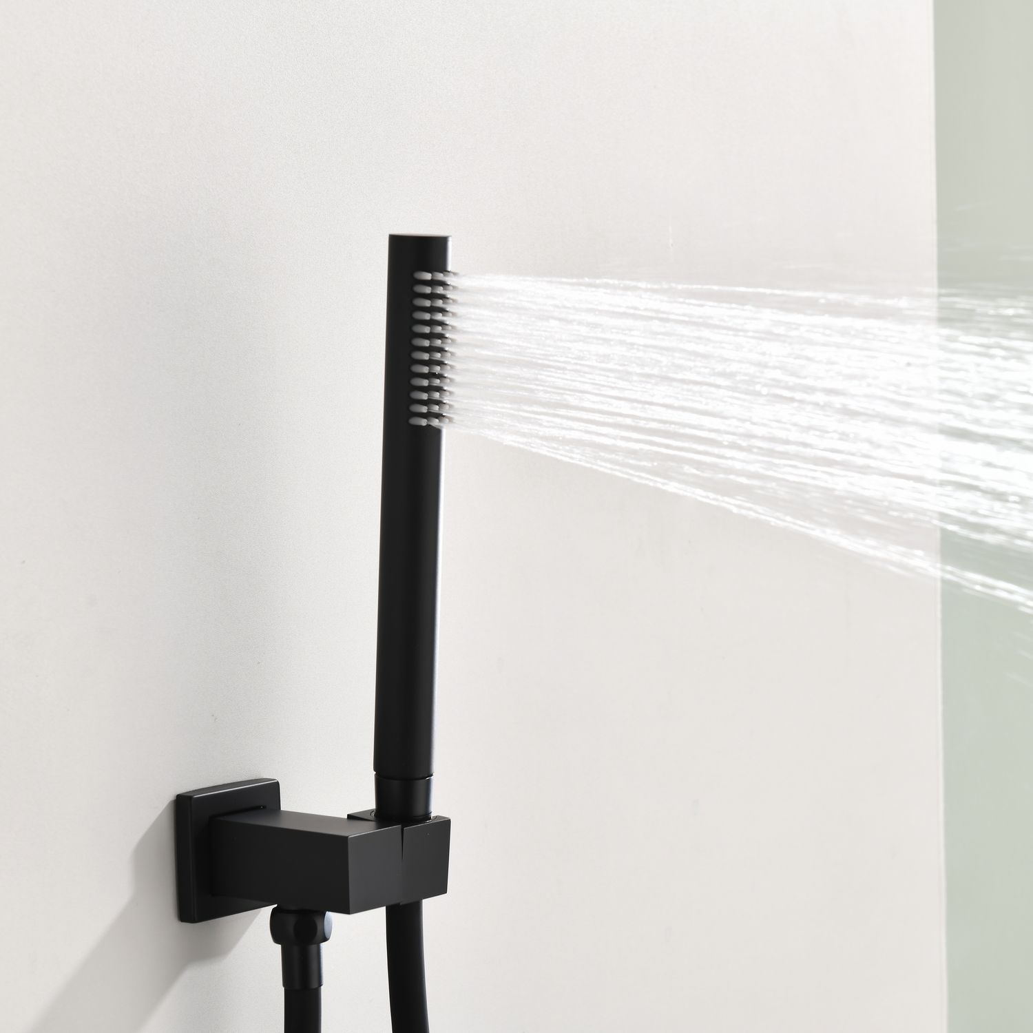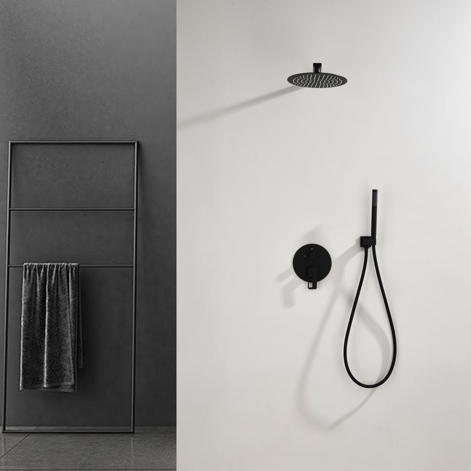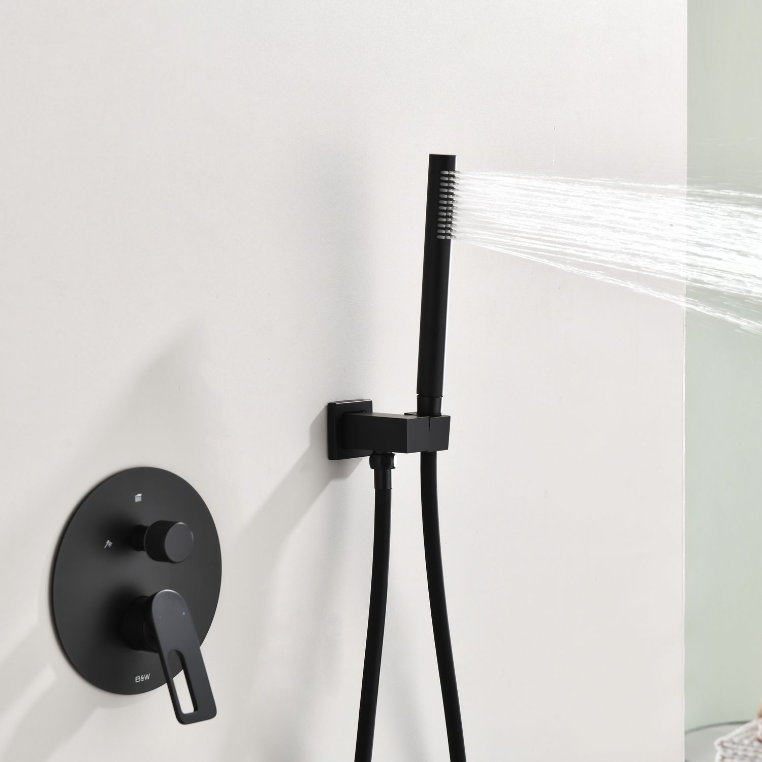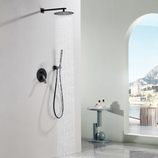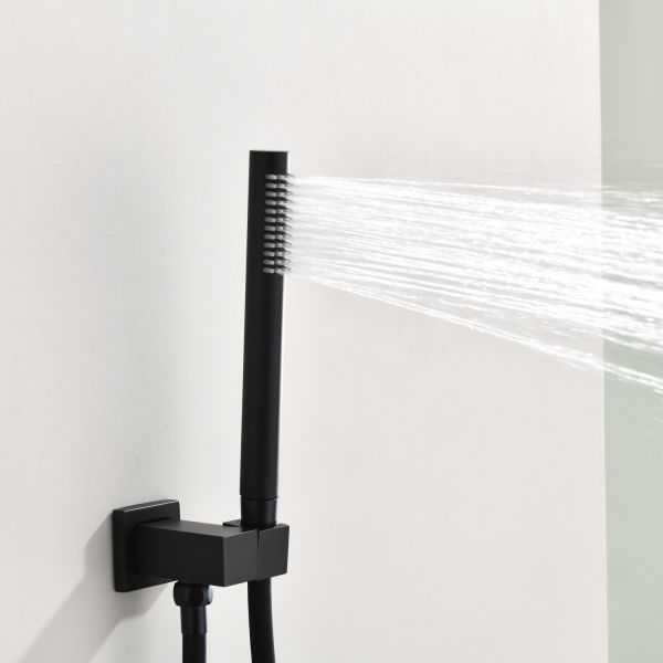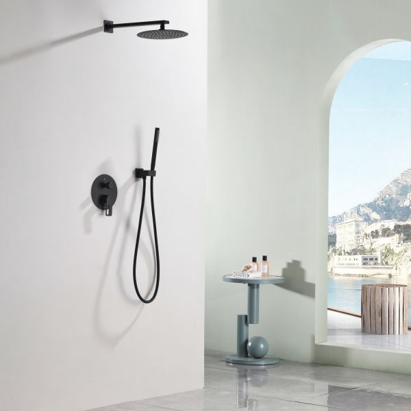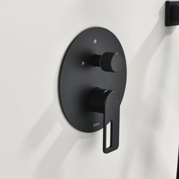 Душевая система скрытого монтажа датского производителя Black&White черного матового цвета. В комплект готового решения входит:кронштейн с верхним душем, блок смесителя с внешней и внутренней частью, а также подключение ручной лейки с держателем. Элементы продукта за исключением леек изготовлены из сантехнической латуни – ресурсного и безопасного для здоровья сплава, а ручной душ и верхняя лейка – из армированного ABS пластика. Для включения и настройки температуры воды установлен керамический картридж и поворотный дивертор. Данное решение позволит сэкономить свободное пространство внутри душевой зоны и сократит количество поверхностей для уборки, а пересечение в концепции дизайна круглых и квадратных форм наполнит Вашу душевую зону уютом и стилем.
