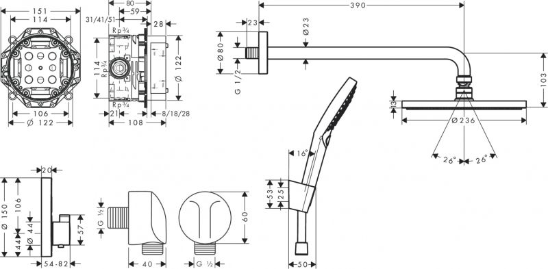 состоит из: верхнего душа, ручного душа, термостата, основного комплекта, розетки, держателя для душа, душевого шланга