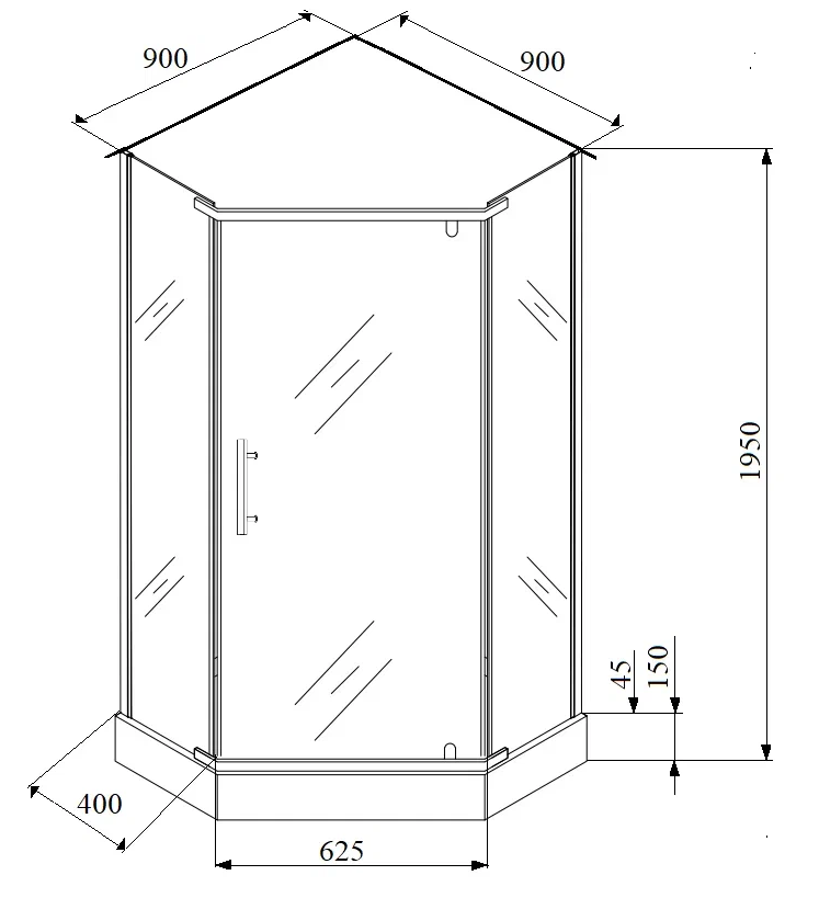 Уголок ZPE911TE душевой PARLY с поддоном (90х90х192)Размер: 90х90х192 смСтильный уголок пятиугольной формы с распашной дверью. Прозрачное стекло и полированный профиль придают модели визуальную легкость. Уголок не утяжеляет пространство и хорошо дополняет любое оформление ванной комнаты.