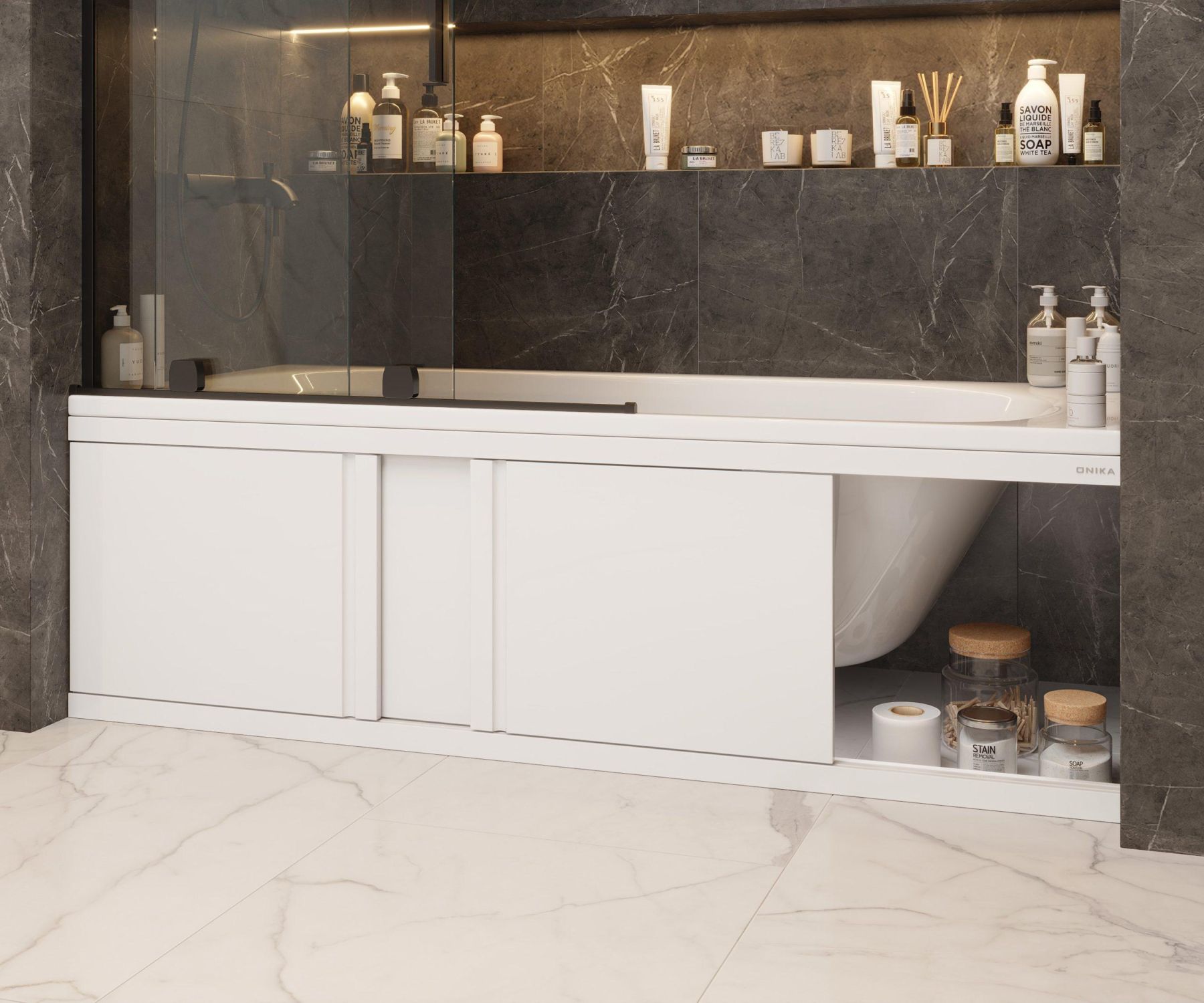 Экран Onika обладает повышенной износостойкостью, отлично переносит эксплуатацию в помещении с высокой влажностью и хорошо сочетается с любыми ваннами.