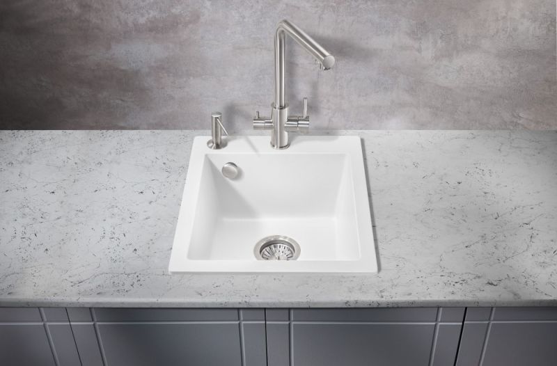 Кухонные мойки MILACIO — эталон стиля и качества даже для самых искушенных ценителей дизайнерской сантехники.Каменная врезная прямоугольная мойка для кухни MILACIO Murcia 42 Cuarzo (MC.77042), выполненная в белом матовом цвете, воплотила в себе лучшие особенности: безупречный вид, лаконичный дизайн, прочность конструкции и комфортное использование. Раковина изготовлена из высококлассного кварцевого композита — смеси частиц кварца и полиэфирных смол — красивого и современного материала, обладающего уникальной прочностью. Искусственный камень устойчив к любым воздействиям — царапинам, ударам, высоким и низким температурам (не боится кипятка и горячей посуды), бытовой химии, пищевым красителям, свету и загрязнению. Даже спустя годы изделие не потеряет цвет и форму и будет должным образом выполнять свои функции. Кухонная кварцевая мойка достаточно компактна, чтобы лучшим образом использовать пространство в небольшой комнате. Размер компенсируется глубокой чашей квадратной формы — в нее поместятся сразу несколько комплектов посуды. Благодаря правильной геометрии мойки капли не разбрызгиваются в стороны, а специальное водоотталкивающее покрытие не дает воде растекаться по поверхности, что сводит загрязнение к минимуму.При этом уход за раковиной достаточно прост: пятна легко убираются чистящими средствами — без подтеков и разводов.