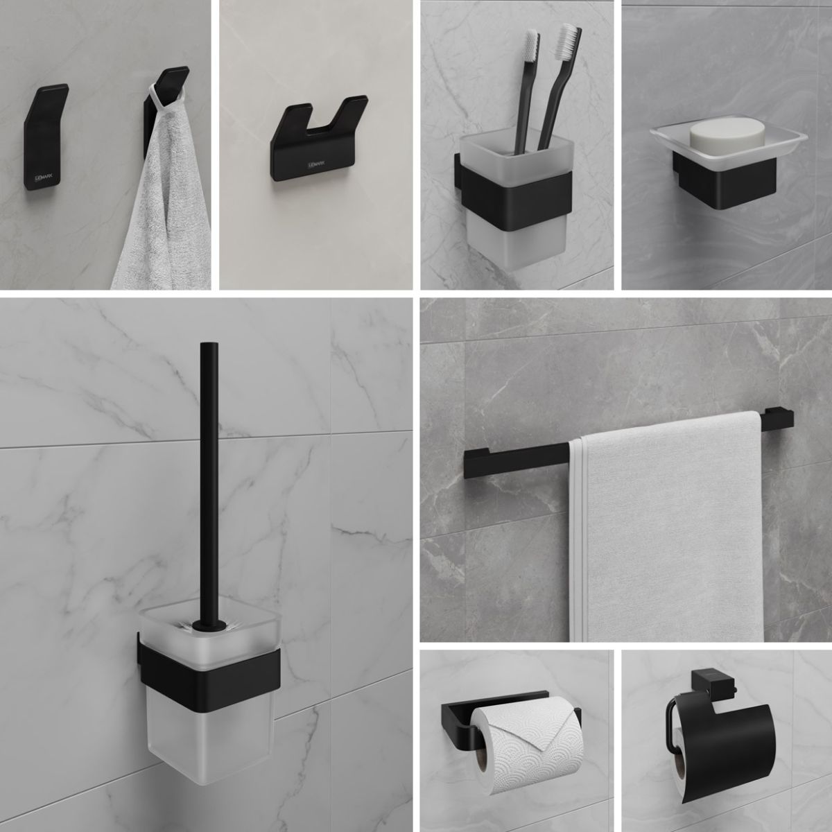 Коллекция представлена в трёх основных цветах: универсальный хром, трендовый чёрный матовый и графит, прекрасно дополнит интерьер ванной и туалетной комнаты, а также добавит функциональности Вашему помещению. Идеально сочетается с сериями смесителей LEMARK в аналогичных цветах.