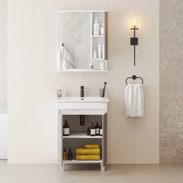 Тумба удобна в использовании, не занимает много места, 2 распашных дверцы с доводчиками скрывают пространство с полкой для хранения.