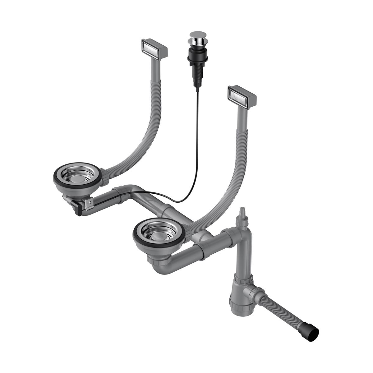 Арматура для двухчашевых моек с прямоугольными переливами, декоративными решетками и клапаном-автомат. Подходит для моек из серии AKISAME