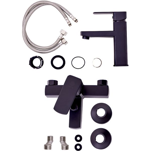 Комплект смесителей Orange OneLife P06-511b.Комплект смесителей изготовлен из запатентованного высокотехнологичного полимера, который выдерживает 510 000 циклов и 53 АТМ без замены изделия после теста на цикличность, а также исключает возможность обжечься при касании и не подвержен коррозии и окислению. Стойкий к отрицательным температурам.Характеристики:Цвет: черный матовый.