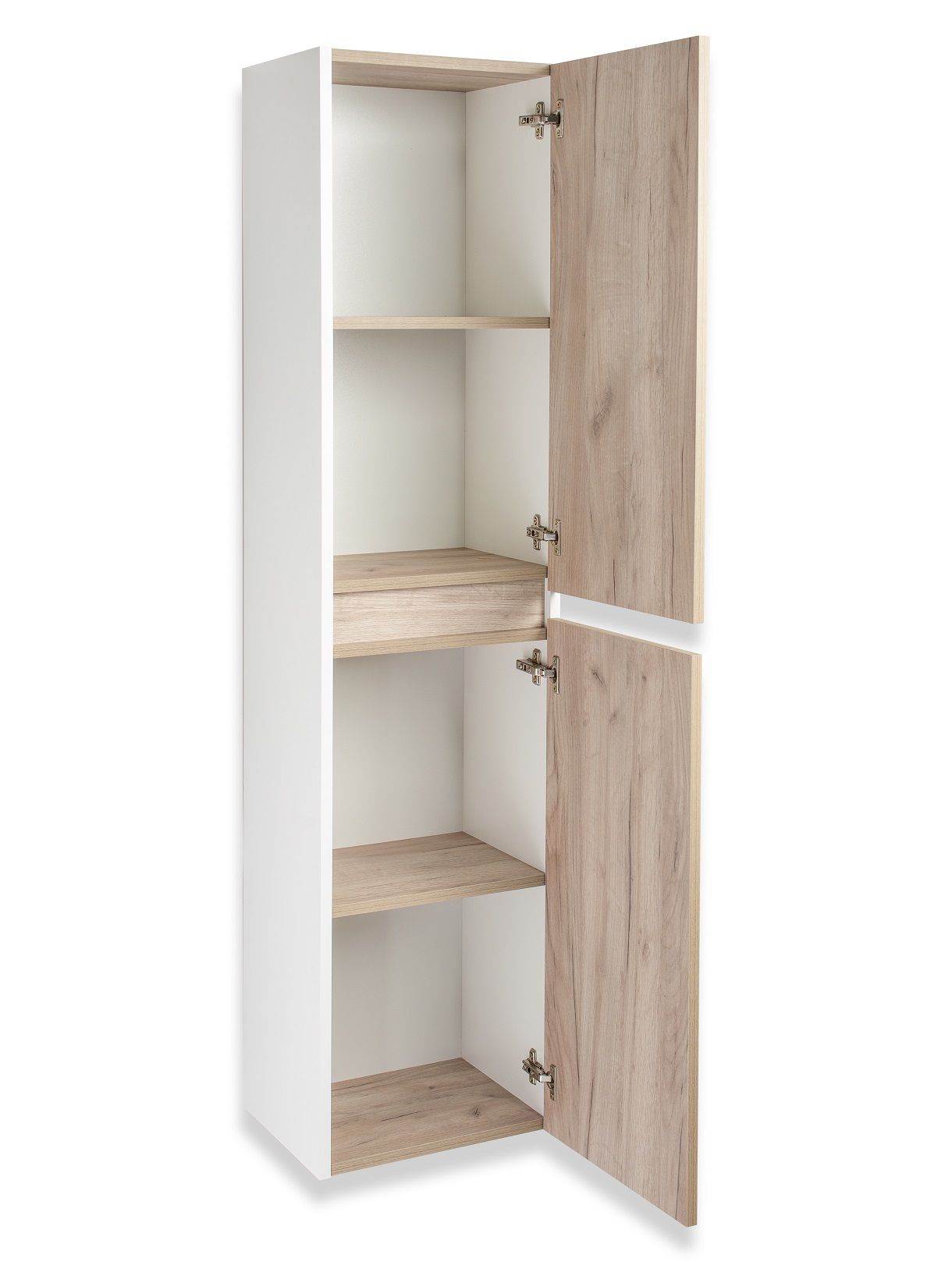 Шкаф пенал для ванной комнаты RUNO Бари (подвесной) - безупречное сочетание модных тенденций с классическим оформлением ванной комнаты. Шкаф в ванную комнату оснащён двумя распашными дверцами, в нижнем и верхнем отделениях по одной встроенной полке. Цвет корпуса классический - белый, при этом цвет фасада в модном цвете – крафтовый дуб, идеально впишутся в любой интерьер ванной комнаты. Каждая дверца укомплектована двумя петлями, верхняя с доводчиком, нижняя без доводчика. Мебель для ванной RUNO - красота и практичность в мелочах!