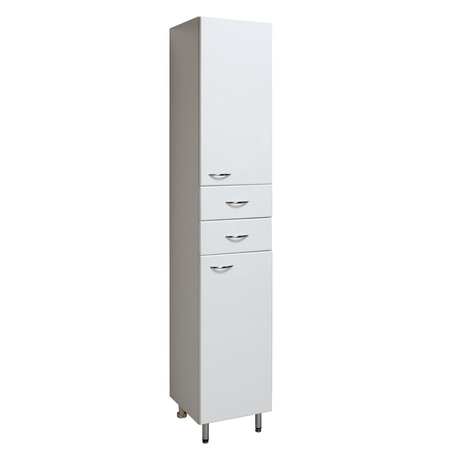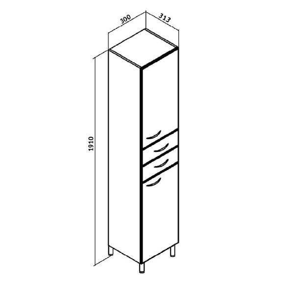 Шкаф-колонна напольный с двумя распашными дверками и выдвижными ящиками. В нижнем и верхнем отделениях - по одной внутренней полке. Ящики - на шариковых направляющих. Петли со встроенным доводчиком, ручки - 4 шт, ножки хром - 2 шт, ножки пластик -2шт.