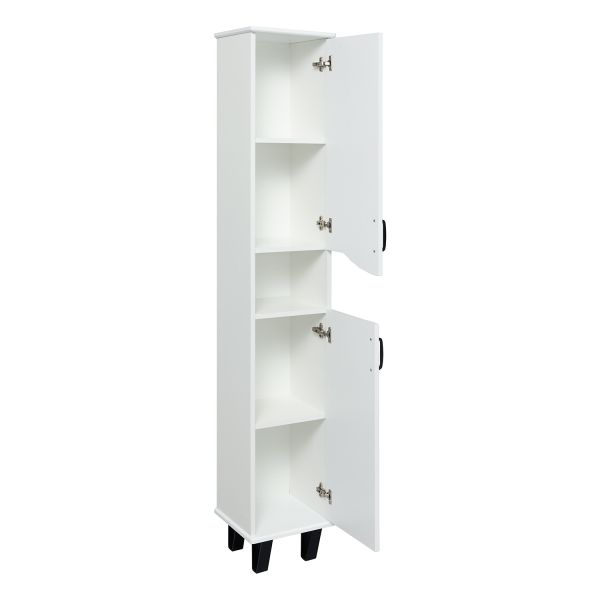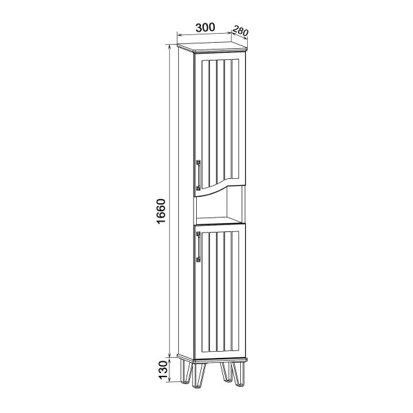 Шкаф-колонна напольный с двумя распашными дверками и открытой нишей посередине. В верхнем и нижнем отделениях по одной встроенной полке. Петли со встроенным доводчиком, ножки черные пластиковые -4шт, ручки черные -2шт. Выпускается только в правом исполнении.