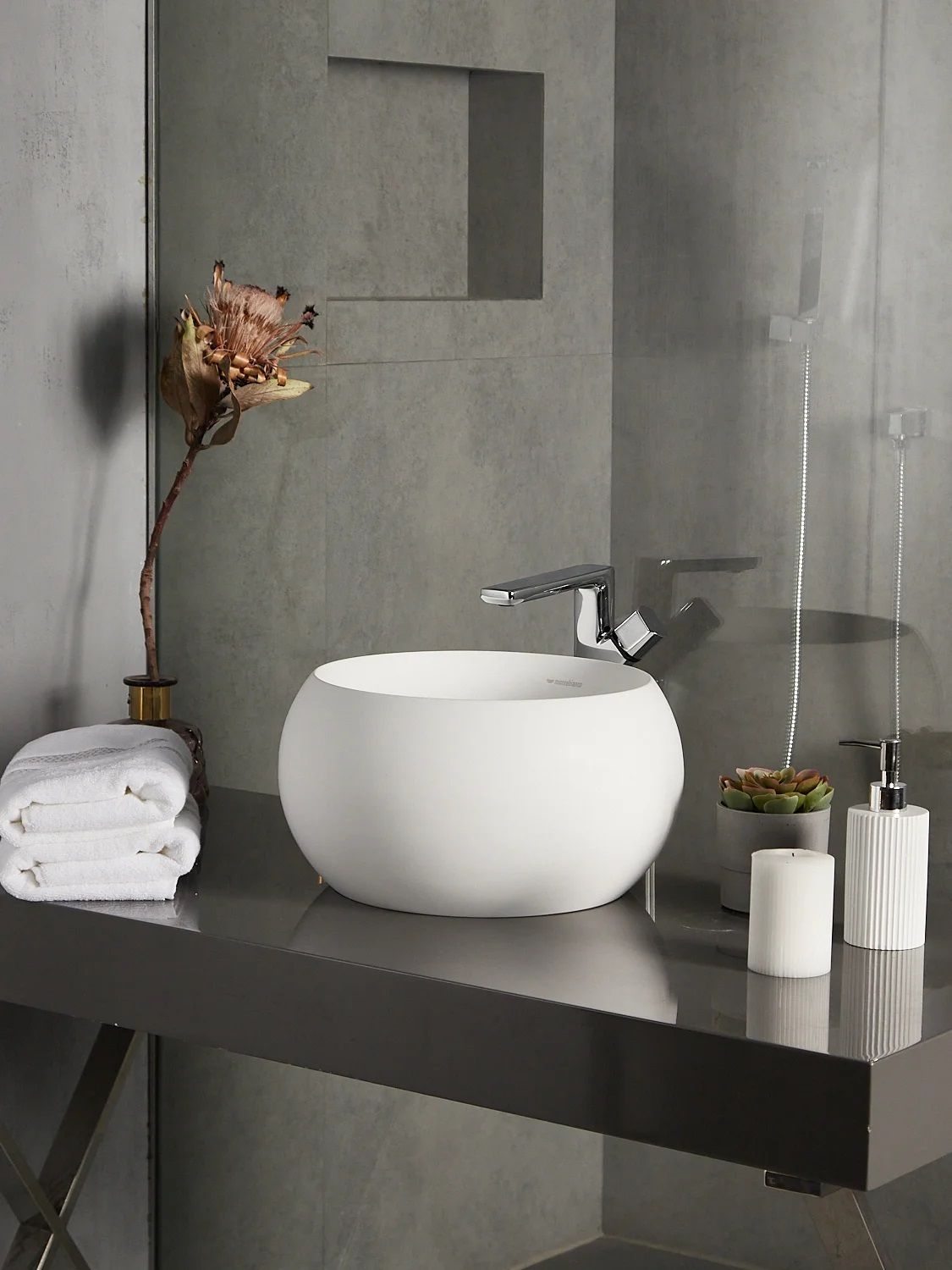 Раковина из искусственного камня для ванной комнаты круглой формы. Дизайн модели необычен и уникален, побуждает пофантазировать над использованием в интерьере. Конструкция полая внутри, что обеспечивает ее легкость. Однако внешне кажется, что раковина высечена из цельного камня. Palla имеет матовую, бархатистую поверхность. Благодаря выпуклой структуре стенок чаши вся поверхность раковины доступна визуально, что позволяет максимально выгодно презентовать ее окружающим. Полимерный материал принимает температуру окружающей среды, поэтому в жилом пространстве данная модель раковины всегда будет приятной на ощупь.Данная модель устанавливается на поверхность столешницы или мебели накладным способом сверху. Чаша обладает большей глубиной, чем многие накладные раковины бренда Montebianco.Уход за раковиной из искусственного камня прост: в большинстве случаев достаточно протереть поверхность влажной губкой с чистящим средством. Материал не впитывает влагу, не порист, непроницаем для плесени, бактерий и грибков.