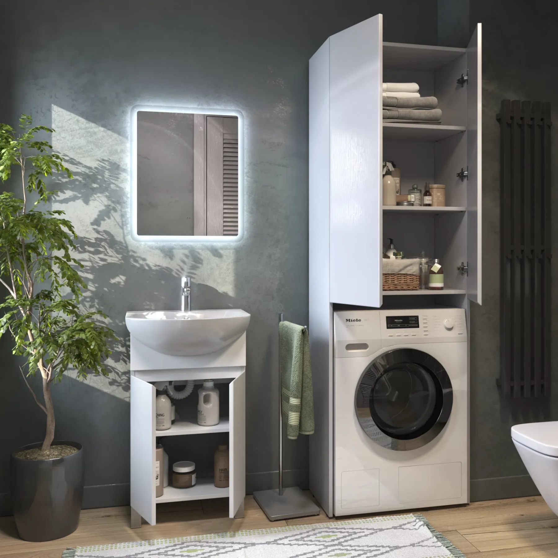 Шкафы Wing – идеальное решение, позволяющее сэкономить пространство ванной комнаты за счет размещения над стиральной машиной