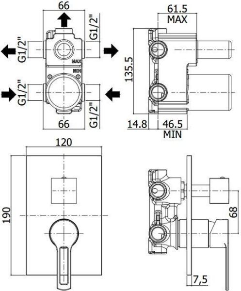 Комплектация:Смеситель на 3 выхода с накладкой из нержавеющей стали, 3 положения + 3 комбо