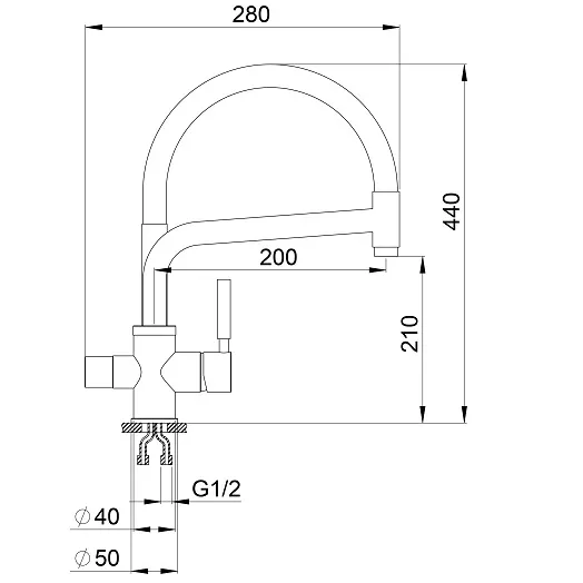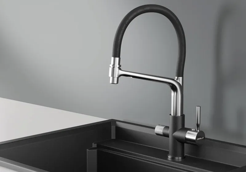 Смеситель для кухни. Цвет-черный. В комплект поставки входит: смеситель, гибкая подводка, комплект креплений, переходник для подключения фильтра с питьевой водой