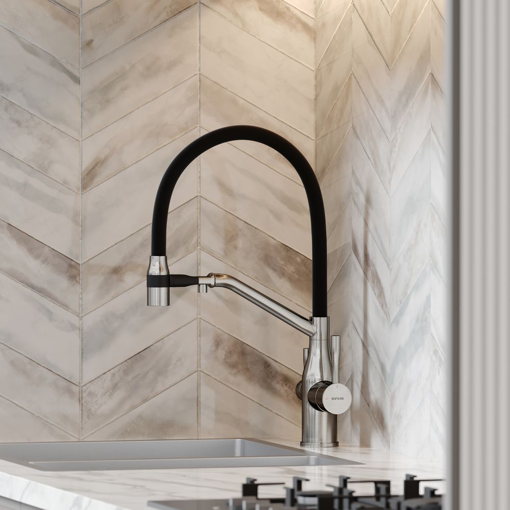 Смеситель для кухни SANCOS Orta с гибким изливом и возможностью подключения фильтра для воды, цвет брашированный никель, арт. SC4008BNФункция "Холодный старт" - при включении смесителя активируется холодной поток, для экономии горячей водыАэратор, гибкая подводка, ключ и крепления для монтажа