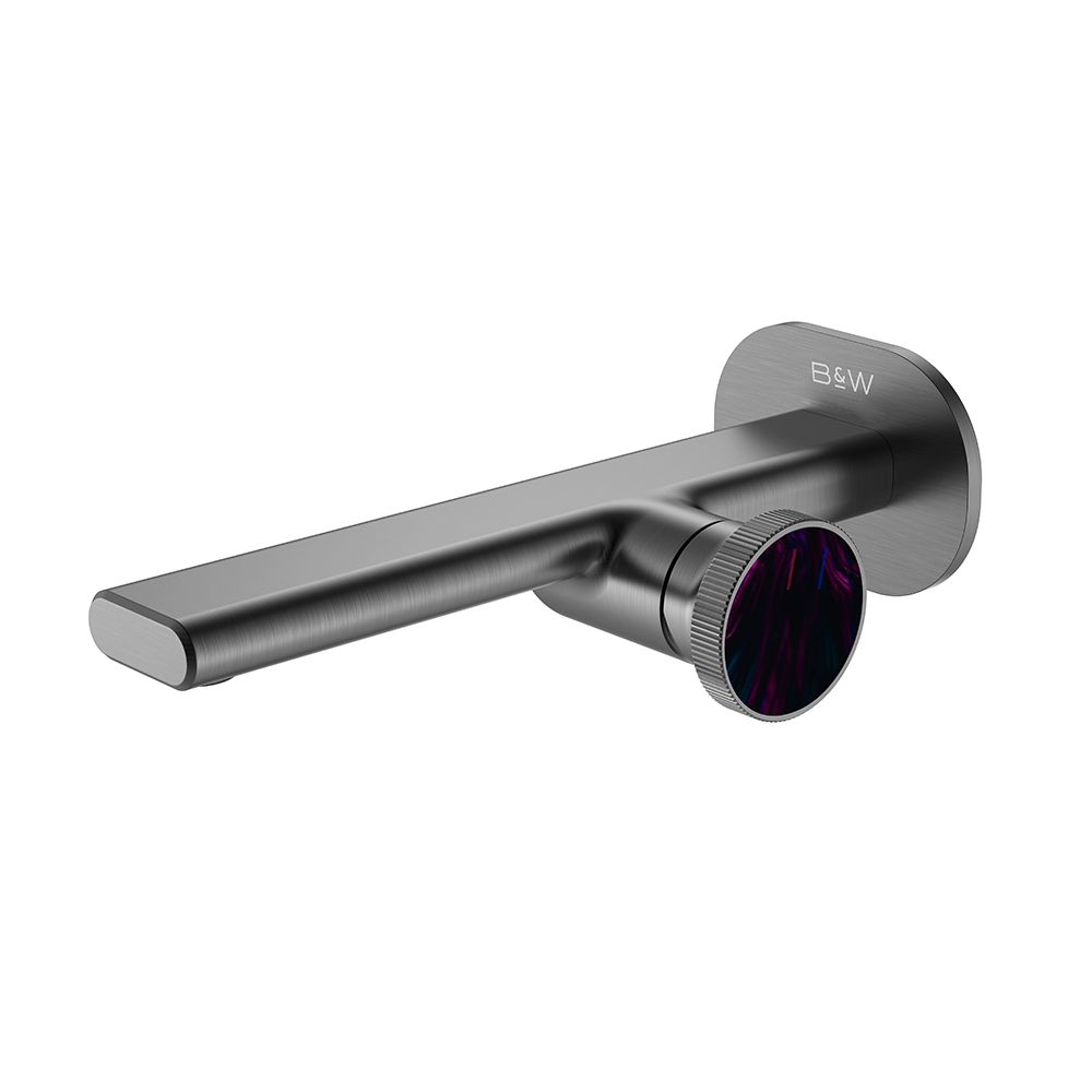 Смеситель для раковины настенного монтажа датского производителя Black&White в цвете оружейная сталь. Наружная и внутренняя часть изделия изготовлена из сантехнической латуни марки HPB 59-  ресурсный и безопасный для Вашего здоровья сплав. Для управления потоками воды и настройки температуры установлен прогрессивный керамический картридж с ручкой в форме диска с насечками, украшенный цветным элементом. В дизайне корпуса пересекаются плавные линии простых геометрических фигур, что гармонично выписывается в современные и классические интерьеры.