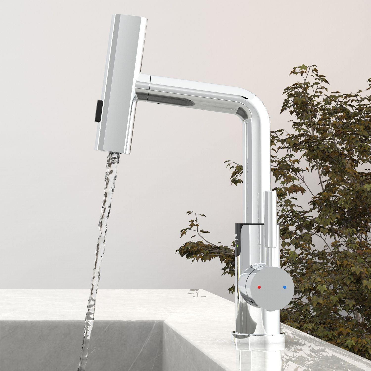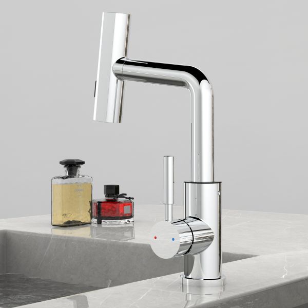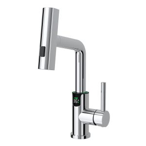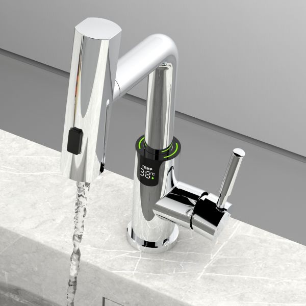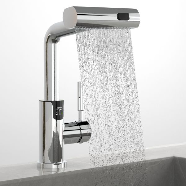 Смеситель для раковины датского производителя Black&White в цвете хром. В корпусе изделия прослеживаются нотки классических форм и современного стиля. Изготавливается из сантехнической латуни для увеличенного запаса прочности и исключения вероятности появление коррозии. Управление потоком воды осуществляется с помощью керамического картриджа повышенной пропускной способности. Инновационным решением можно отметить электронное табло, расположенное в нижней части корпуса, на которое выводится показание температуры воды с подсветкой красного, зеленого и синего цвета. В данном продукте реализован многофункциональный излив с возможностью настройки высоты и длинны с помощью вытяжного шланга. Аэратор смесителя оборудован несколькими видами подачи воды, которые переключаются с помощью кнопки расположенной сверху корпуса.