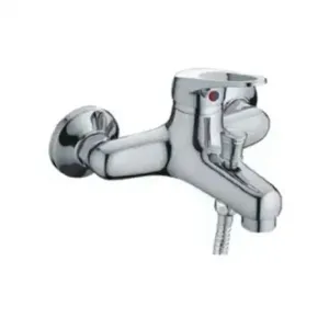 Смеситель для ванны латунный хромированный. Однорычажное управление, стационарный короткий излив с установленным аэратором, переключение с излива на душ при помощи штока, керамический картридж 35 мм. Смеситель укомплектован душевой лейкой с одним режимом, душевым шлангом длиной 1,5 м, отражателями и набором эксцентриков. Присоединительный размер 1/2, монтаж настенный на два отверстия.