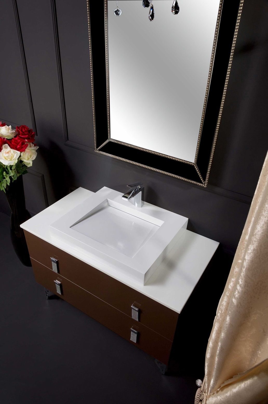 Столешница изготовлена из инновационного материала Solid Glass, в состав которого входит мраморная крошка и стекло. Материал черезвычайно прочен, не оставляет следов царапин и обладает неповторимой глубиной белого цвета.