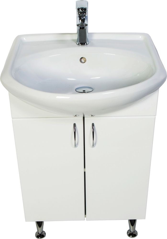 Напольная тумба с раковиной. Дверки c механизмом доводчика, обеспечивающим плавное закрывание. Фасад МДФ в пленке, цвет белый глянец. Корпус ЛДСП - белый глянец. Раковина - фарфор. Фурнитура в цвете хром. В комплекте н-р ножек и внутренняя полочка. Зеркальный шкаф для комплекта (арт. LA-50TUW+RA) приобретается дополнительно.