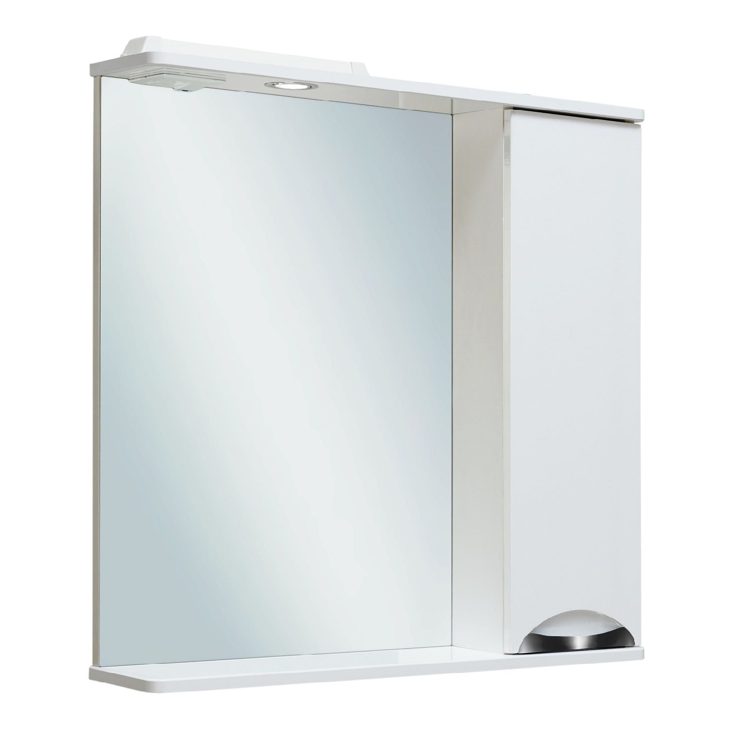 Зеркальный шкаф оборудован одним врезным светодиодным светильником 220В и розеткой с выключателем. Справа шкафчик с распашным фасадом, за которым две внутренние полки. Петли со встроенным доводчиком, ручка -1 шт. Выпускается только в правом исполнении.
