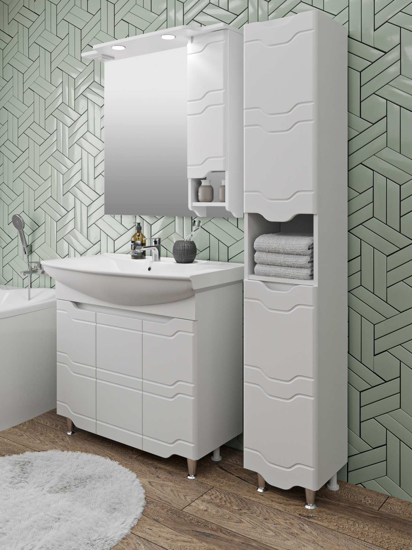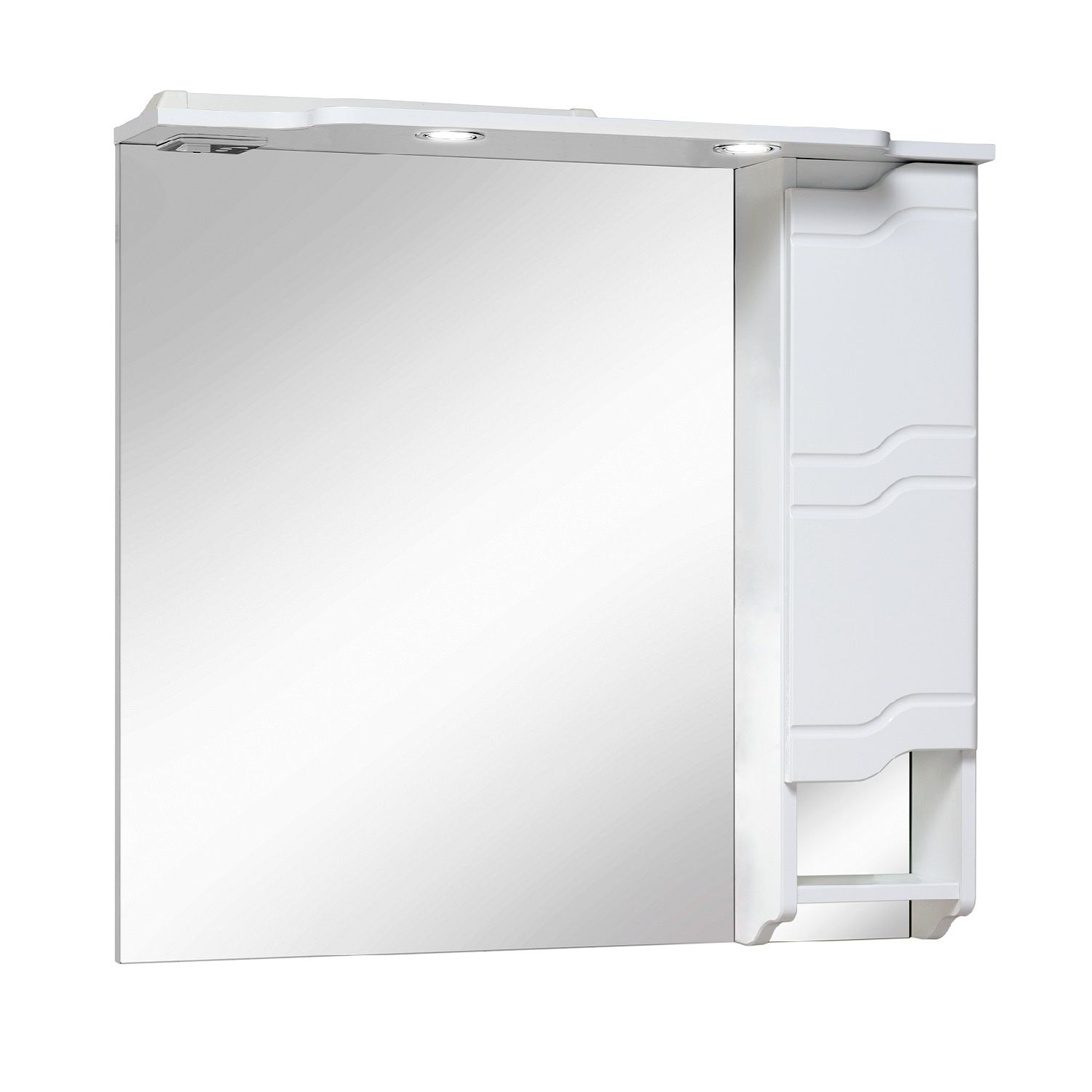 Зеркальный шкаф оборудован двумя врезными светодиодными светильниками 220В и розеткой с выключателем. Справа - шкафчик с распашной дверцей и одной внутренней полкой. Под шкафом - открытая полочка. Петли со встроенным доводчиком. Выпускается только в правом исполнении.